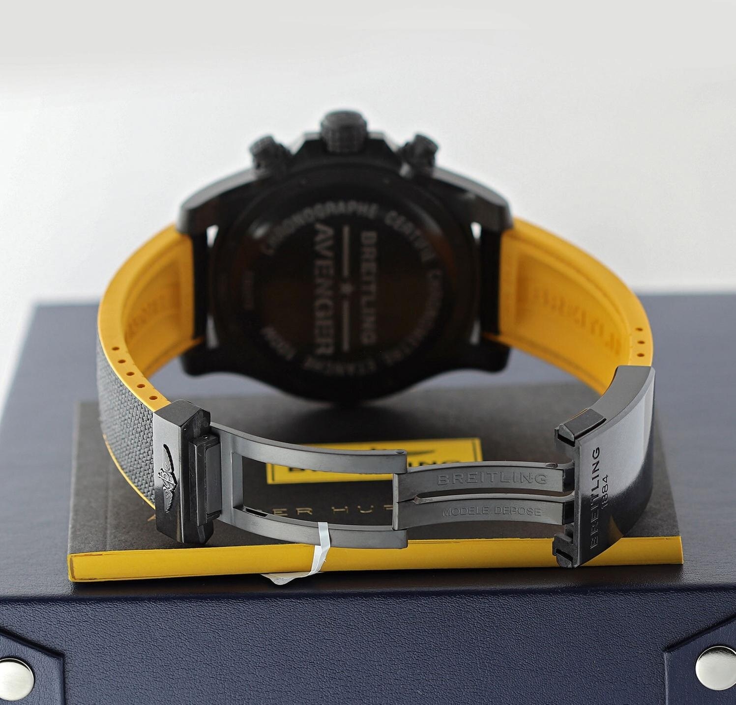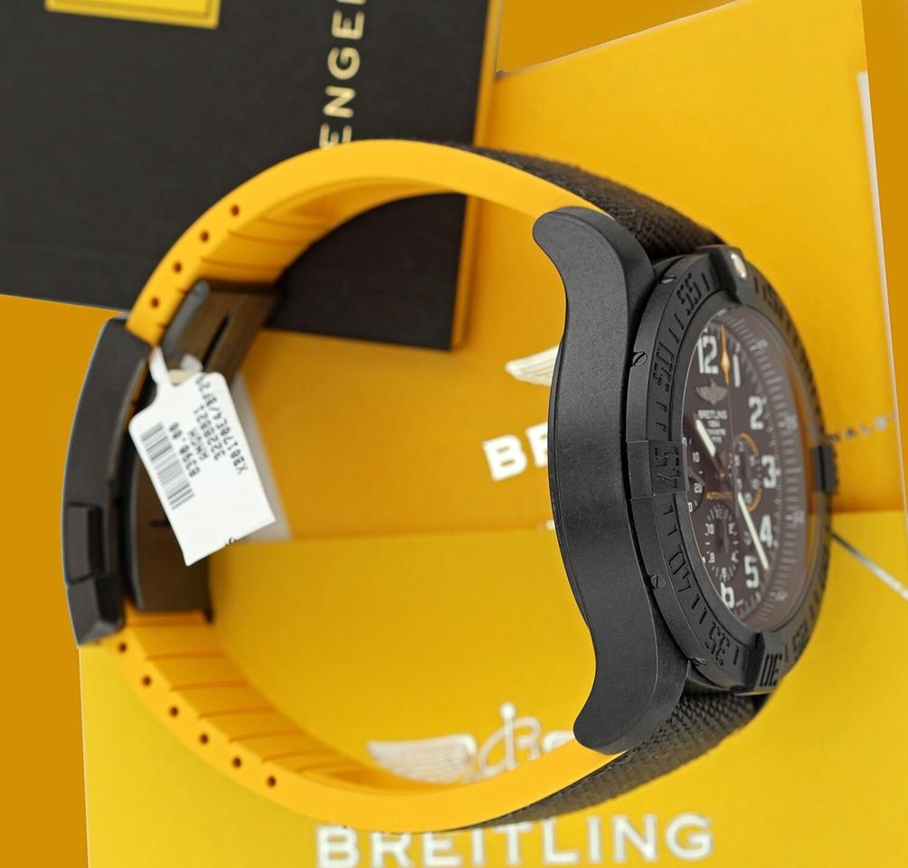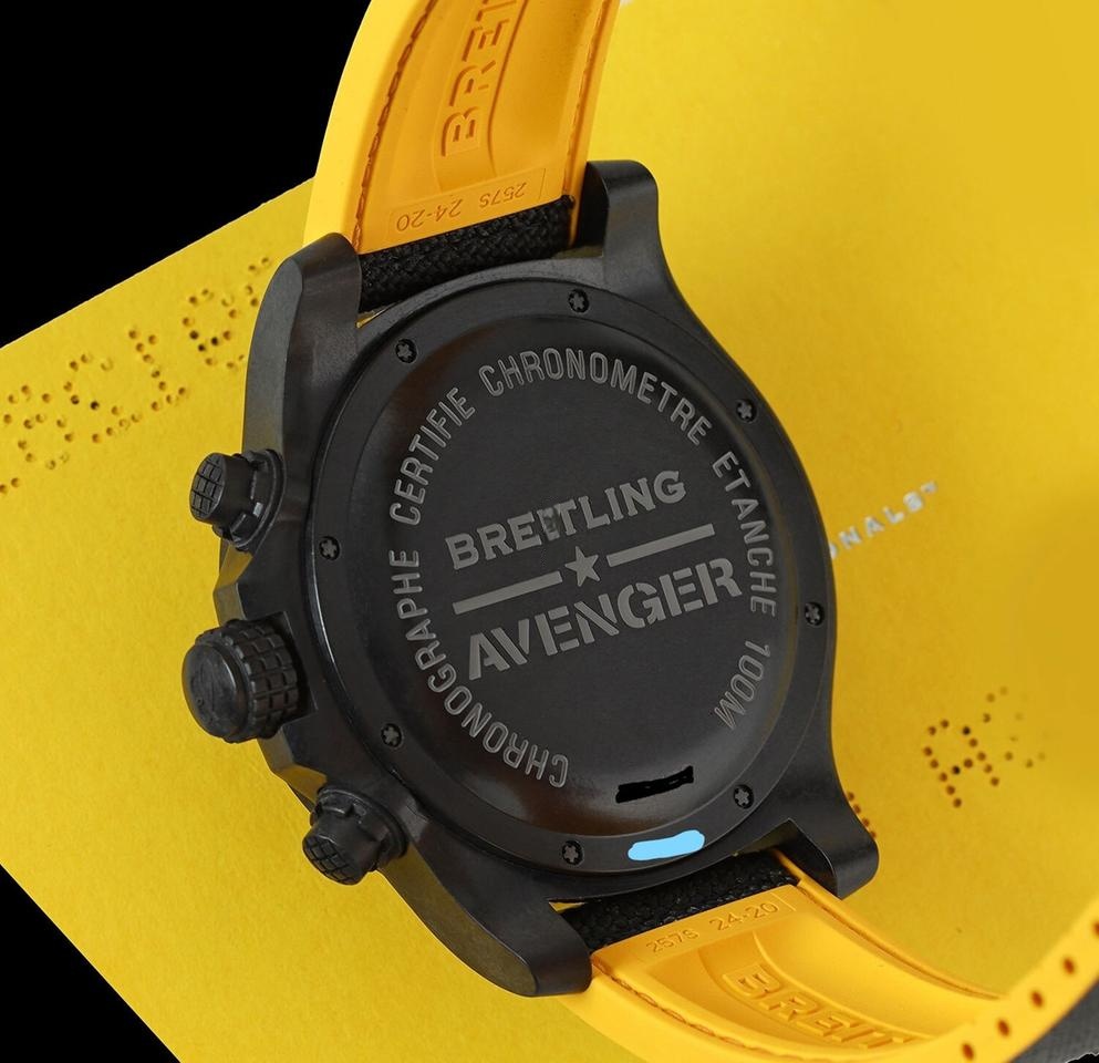 This Avenger Hurricane is a super light sporty chronograph and a perfect example of why the colors black and yellow are seemingly meant for each other. This chronograph not only looks quite sporty, it actually is. Breitlight is a super light and robust material, developed by Breitling. The case itself barely hits the 30-gram mark which makes it feel extremely light on the wrist.