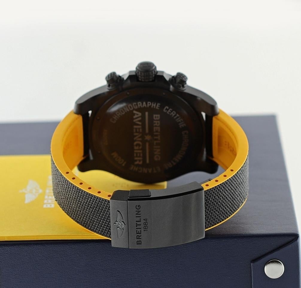 What's to say about caliber B01? Most notably it’s the first Chronograph movement developed inhouse by Breitling. And like any movement used by Breitling it's COSC certified. But not only is it very accurate, it's reliable and robust too. It generally says a lot about a watch movement, when the manufacturer offers a 5-year international warranty. The watch comes on a yellow rubber strap with a black fabric overlay.