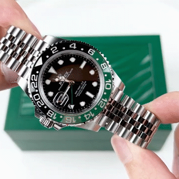 The case is stainless steel with brushed lugs and high-polish finished sides. The bezel is steel with a black and green 24-hour ceramic insert. Stainless steel left sided crown and case back are screw-down to keep the watch water-resistant. It features an oyster bracelet where links are polished down the middle and brushed on either side.