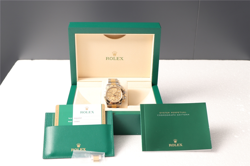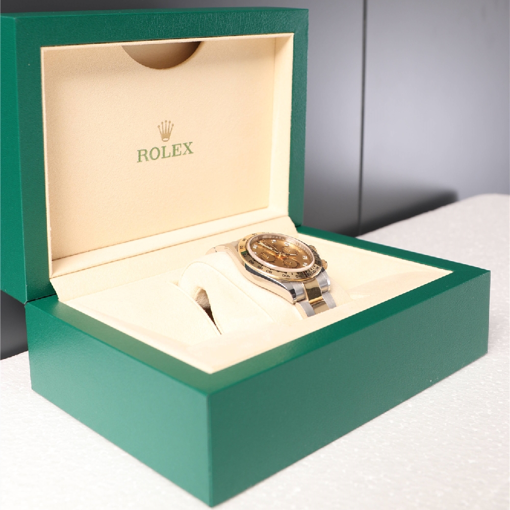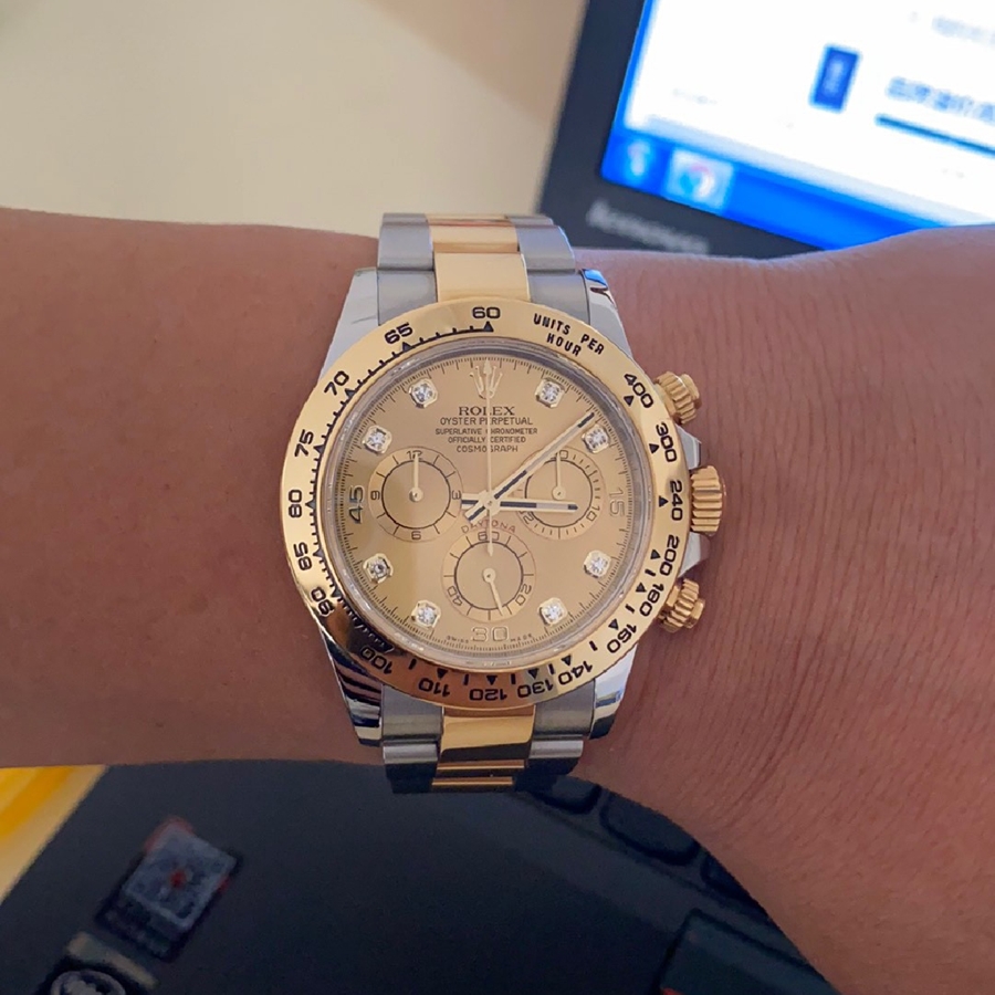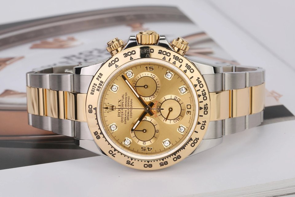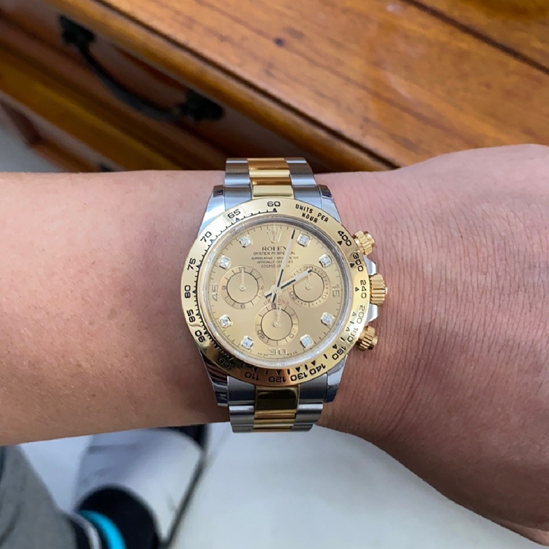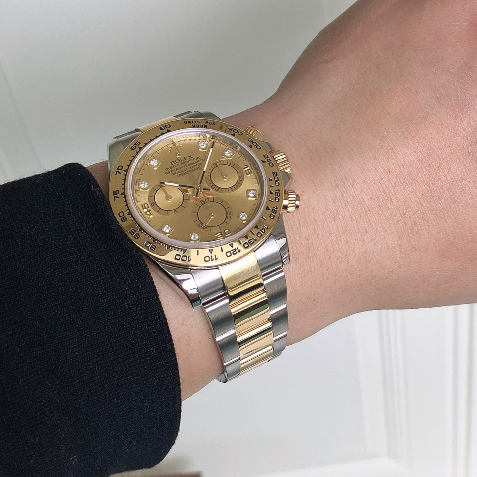 Stainless steel case with a stainless steel Rolex oyster bracelet with 18kt yellow gold center links. Fixed 18kt yellow gold bezel showing tachymeter markings. Champagne dial with luminous yellow gold-tone hands and diamond hour markers.