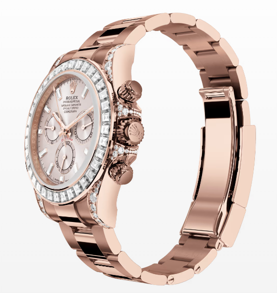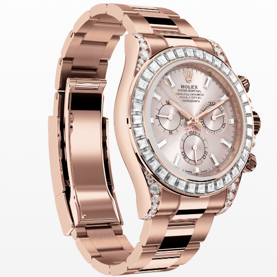 This Oyster Perpetual Cosmograph Daytona in 18 kt Everose gold, with a Sundust, diamond-set dial and an Oyster bracelet, features a diamond-set bezel and diamond-set lugs.