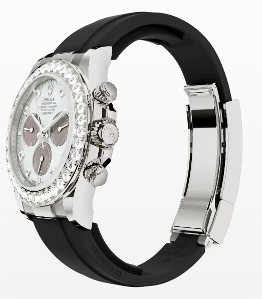 This Oyster Perpetual Cosmograph Daytona in 18 kt white gold, with a white and black mother-of-pearl, diamond-set dial and an Oysterflex bracelet, features a diamond-set bezel.