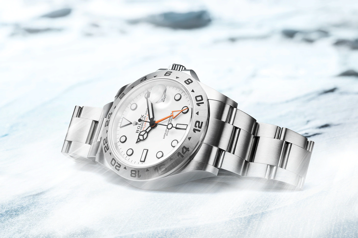 The Explorer II is equipped with an additional 24-hour display; a dedicated hand circles the dial in 24 hours rather than the usual 12, pointing to a fixed bezel with 24 hour graduations.