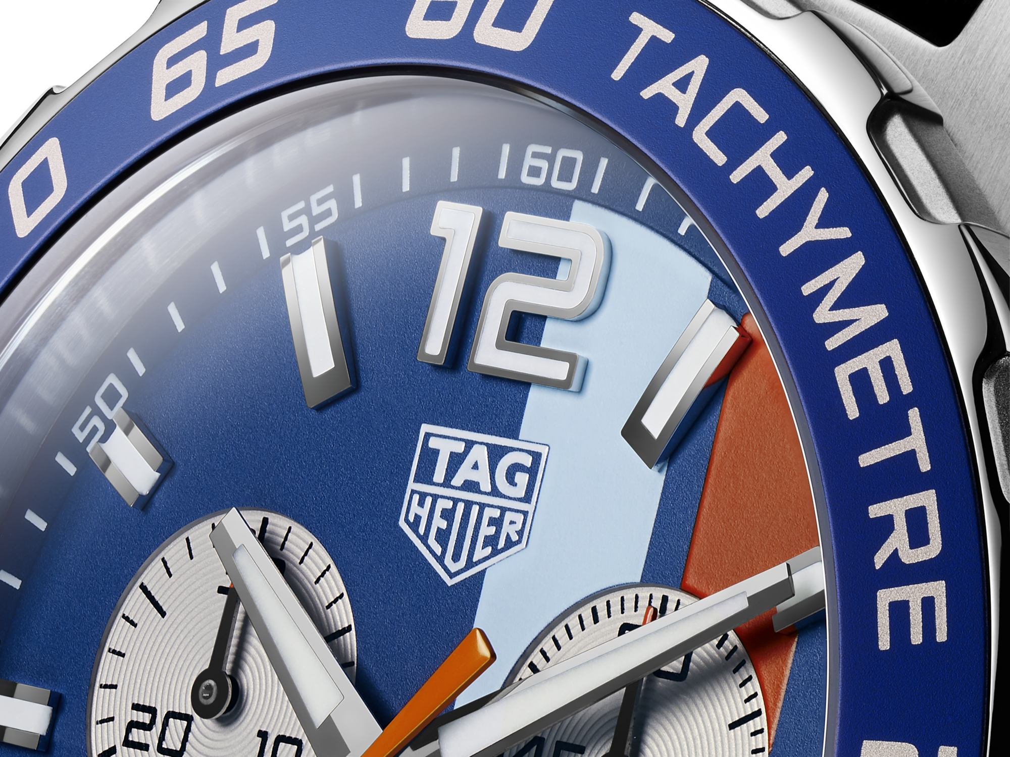 The TAG Heuer Gulf Formula 1 chronograph pays powerful tribute to two of motor racing’s greatest sponsoring legends. The brushed Gulf shield-blue dial sports the brand’s orange and blue stripes, as did Steve McQueen’s car in the 1971 film classic, Le Mans.